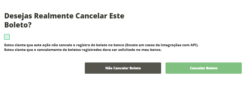 Importante! O ERP dispõem de uma configuração que determina que ao cancelar o boleto, será excluído o registro do lançamento financeiro. Caso seu ERP esteja configurado desta forma, esteja ciente desta ação. Além disso, se o boleto foi gerado de uma venda, ao cancelar o boleto e excluir o lançamento, automaticamente o estoque dos produtos vendidos retorna para o depósito.