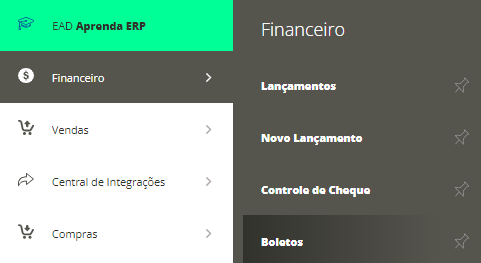 Primeiramente, acesse o menu lateral Financeiro, submenu Boletos.